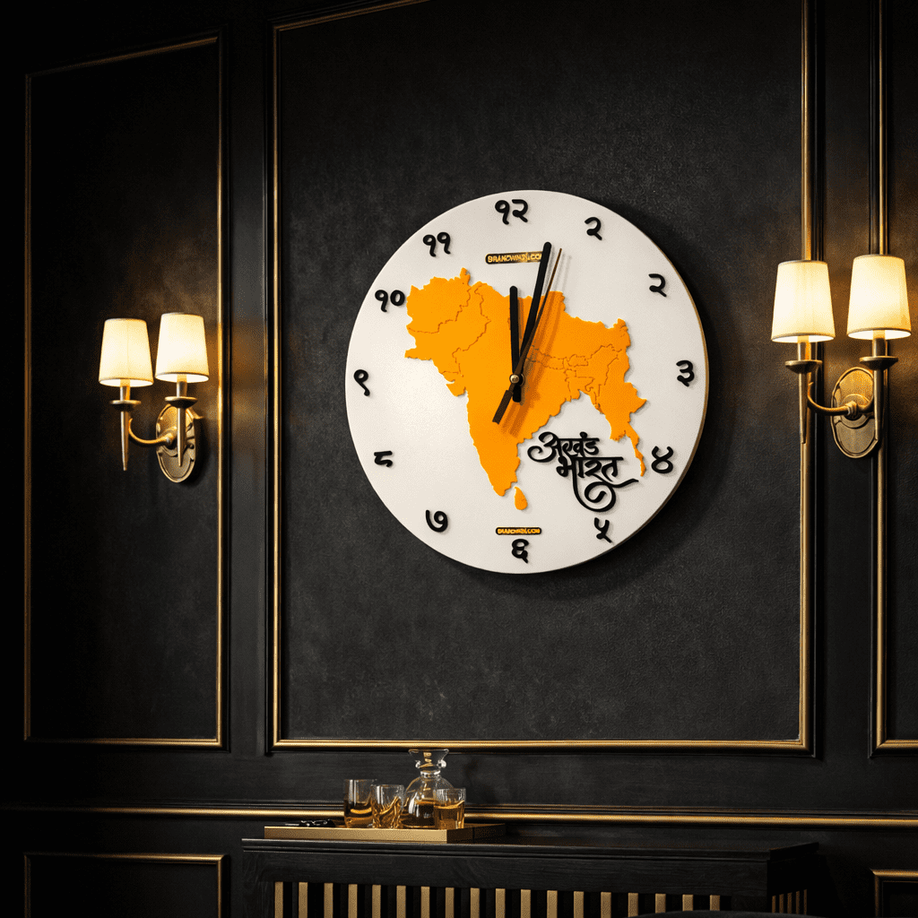 Premium Akhand Bharat Wall Clock crafted with gloss acrylic with silent sweep motion. Elegant heritage design, 1-year warranty. A timeless statement for your home.
